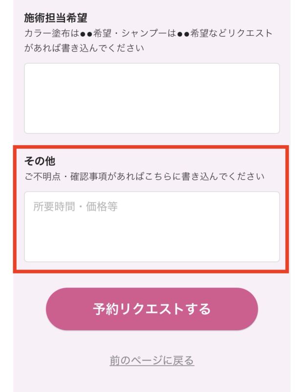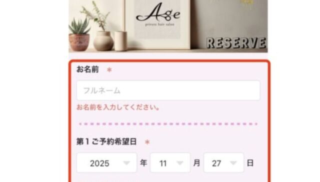 “お名前”の欄の箇所に、お子様ご本人様のお名前でも、ご予約リクエストを送っていただいた方でもどちらでも構いません。