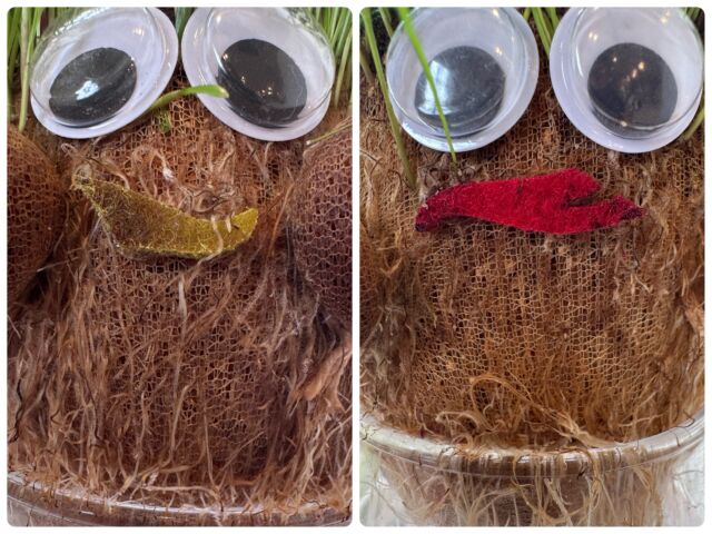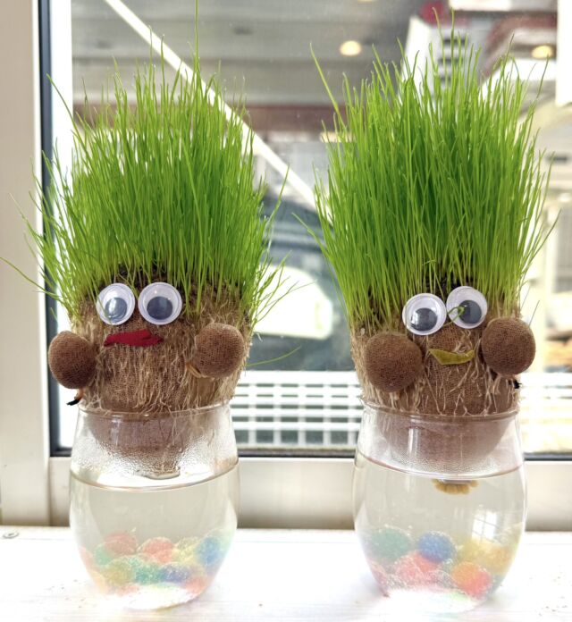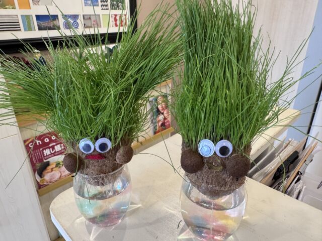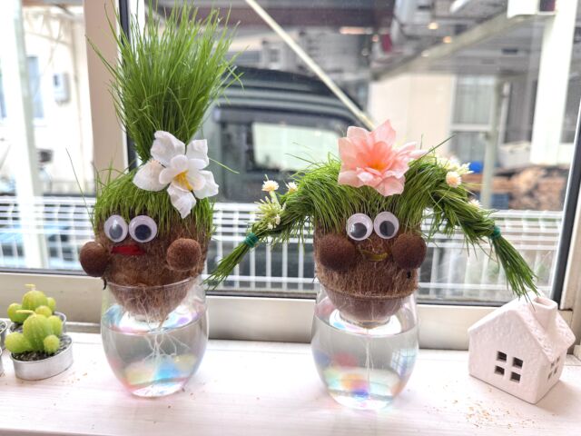 人形の頭に芝生の種が植えてあり、水を吸い上げて育ちます。
