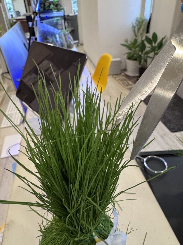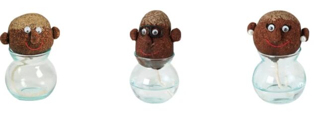これは、下の瓶に水を張って明るい出窓におくとスクスクと髪の毛のように芝生が伸びてくる水耕栽培キットです。