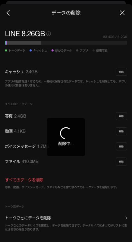トップページ画面右上の「歯車アイコン」→「トーク」→「データの削除」→「キャッシュ」