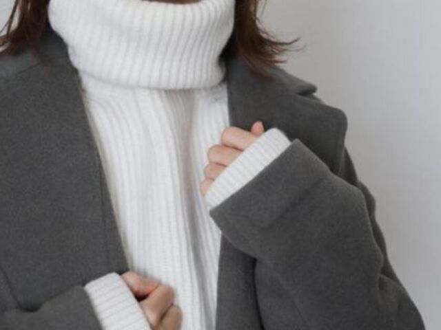 ハイネックやアウターなど、生地感が厚い洋服を着る機会が大半のため、夏の軽装と比べて肩の位置が高くなります。