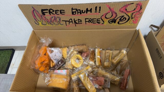 おすそ分けでバックヤードにたくさんのバームクーヘンを置いてあり、自由に食べてもらっています。