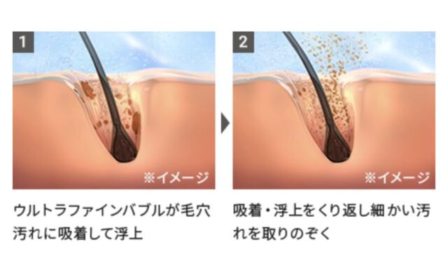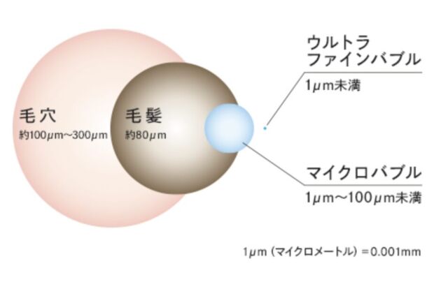 しかし、ファインバブルはその微細なサイズのおかげで、毛穴や髪の隙間に入り込み、従来の洗浄方法では取り除けなかった汚れや残留物質、薬剤特有の匂いまで効果的に洗浄除去することが可能です。超微細な気泡により、頭皮や髪にダイレクトに当たっていた水流から守り優しく作用します。