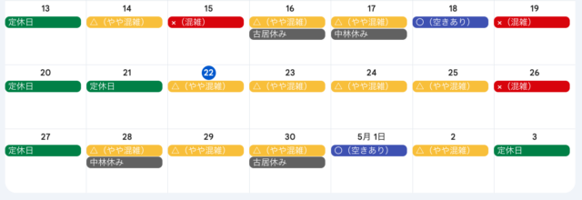 ※前日までの混雑状況となります。更新のタイミングによっては空きがない場合もございます。